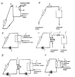 а) -с естественной циркуляцией; б) -одноконтурная; в) -двухконтурная; г) -двухконтурная с постоянной температурой воды; д) -трехконтурная; е) -с двумя змеевиками в баке-аккумуляторе