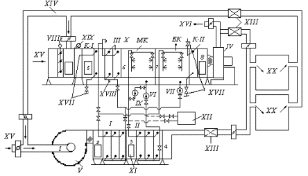 Рис. 1. Рабочая схема двухступенчатой бескомпрессорной системы кондиционирования воздуха 1, 2, 3, 4 – состояние воздуха при его обработке в приточном кондиционере; 5, 6, 7, 8 – состояние воздуха при его обработке в испарительном кондиционере; I, II, III – теплообменники (воздухоохладители); К-I, K-II – соответственно теплообменники первого и второго подогрева; МК – оросительная камера малого контура циркуляции; БК – оросительная камера большого контура циркуляции; IV, V – соответственно вентиляторы испарительного и приточного кондиционеров; VI, VII – соответственно циркуляционные насосы малого и большого контуров циркуляции; VIII – воздушные заслонки; IX – насос для адиабатического увлажнения воздуха; X – испарительный кондиционер; XI – приточный кондиционер; XII – бак-аккумулятор; XIII – шумоглушитель; XIV – вытяжной или рециркуляционный воздух; XV – наружный воздух; XVI – выброс в атмосферу; XVII – места присоединения к трубопроводам ТЭЦ; XVIII – кран для спуска воды из теплообменников; XIX – фильтр; XX – обслуживаемые помещения