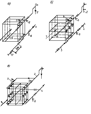 Рис. 6. Принципиальная схема обвязки теплообменников (см. пп. 2.7 и 2.8) а – теплообменников I и III из калориферов типа КВБ; б – теплообменников I и III из калориферов типа К4ВП или из типовых секций кондиционеров К-30 и Кт-40; в – теплообменника II из калориферов типа К4ВП, КВБ или из типовых секций кондиционеров типа Кт-60 и Кт-80; 1 – трубопровод холодной воды от камеры орошения; 2 – трубопровод отепленной воды к камере орошения; 3 – кран для удаления воздуха; 4 – трубопровод горячей воды из теплосети; 5 – трубопровод обратной воды в теплосеть; 6 – кран для спуска воды; 7 – охлаждаемый поток воздуха 2.22. При проектировании двухступенчатых бескомпрессорных систем кондиционирования воздуха необходимо предусматривать следующие схемы автоматического регулирования температуры воздуха в обслуживаемых помещениях в теплый период года: а) двухпозиционное регулирование расходов воды в контурах циркуляции оросительных камер БК и МК (рис. 7);