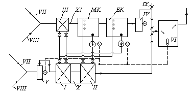 Рис. 7. Принципиальная схема двухпозиционного регулирования бескомпрессорной системы кондиционирования воздуха I, II, III – теплообменники (воздухоохладители); IV, V – соответственно вентиляторы испарительного и приточного кондиционеров; VI – датчик температуры воздуха в помещении; МК, БК – соответственно оросительные камеры малого и большого контуров циркуляции; VII – наружный воздух; VIII – рециркуляционный воздух; IX – выброс в атмосферу воздуха в теплый период года; Х – приточный кондиционер; XI – испарительный кондиционер б) пропорциональное регулирование расхода воды в контуре циркуляции оросительной камеры МК (рис. 8) и двухпозиционное регулирование расхода воды в контуре циркуляции оросительной камеры БК.