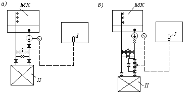 Рис. 8. Принципиальные схемы автоматизации малого контура циркуляции бескомпрессорной системы кондиционирования воздуха а – схема с клапаном на перемычке; б – схема с двумя взаимообратными клапанами; МК – оросительная камера малого контура циркуляции воды; I – датчик температур воздуха в помещении; II – теплообменник (воздухоохладитель) 2.23. В случае применения схемы регулирования, приведенной на рис. 7, при понижении температуры воздуха в помещении ниже расчетной вначале следует предусматривать выключение насоса в контуре циркуляции оросительной камеры БК, а затем насоса в контуре циркуляции камеры МК. При повышении температуры воздуха в помещении включение указанных насосов следует предусматривать в обратном порядке. 2.24. Пропорциональное регулирование расхода холодной воды в теплообменнике II следует предусматривать при постоянном ее расходе в оросительной камере МК по одной из следующих схем: с клапаном расхода воды на перемычке; с трехходовым клапаном; с двумя взаимообратными клапанами. 2.25. Допускается применение пропорционального регулирования расхода воды в контуре циркуляции оросительной камеры БК. Кроме того, допускается при понижении температуры в помещении ниже расчетной предусматривать отключение теплообменника III. При дальнейшем понижении температуры в помещении следует предусматривать отключение насоса в контуре циркуляции оросительной камеры БК. 2.26. При проектировании двухступенчатых бескомпрессорных систем кондиционирования воздуха по схеме на рис. 2, в контуре циркуляции воды оросительной камеры МК должны быть установлены регуляторы давления "до себя". 2.27. При выполнении требований п. 2.6 настоящей Инструкции схема автоматического регулирования параметров воздуха в обслуживаемых помещениях в холодный и переходный периоды года (при работе испарительного кондиционера по схеме на рис. 1) аналогична типовым схемам обычных центральных кондиционеров, разработанным ГПИ Сантехпроект. Приложение 1Принцип работы двухступенчатой бескомпрессорной системы кондиционирования воздуха1. Двухступенчатая бескомпрессорная система кондиционирования воздуха (БСКВ) состоит из двух самостоятельных кондиционеров – приточного и испарительного (рис. 1), связанных между собой контурами циркуляции воды. 2. Приточный кондиционер БСКВ (рис. 1) состоит из следующих основных элементов: поверхностного теплообменника I; поверхностного теплообменника II; вентилятора V. Испарительный кондиционер (рис. 1) состоит из следующих основных элементов: поверхностного теплообменника III; оросительной камеры МК; оросительной камеры БК; вентилятора IV. 3. В БСКВ имеются два самостоятельных контура циркуляции воды, рис. 1: контур циркуляции оросительной камеры МК (малый контур), включающий теплообменник II, оросительную камеру МК и циркуляционный насос VI; контур циркуляции оросительной камеры БК (большой контур), включающий параллельно соединенные по холодоносителю теплообменники I и III, оросительную камеру БК и циркуляционный насос VII. 4. В теплый период года тепло приточного воздуха отводится к воде, циркулирующей в теплообменниках I и II. Охлаждение воды, нагретой в теплообменниках I и III, осуществляется в оросительной камере БК большого контура циркуляции воды. Охлаждение воды, нагретой в теплообменнике II, осуществляется в ороситель
