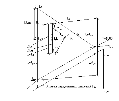 R = 1 + 2,34a; B – коэффициент орошения; tвн – начальная температура воды, град; tвк – конечная температура воды, град; tp – температура точки росы воздуха, град. е) теплосодержание воздуха после оросительной камеры I7 = I6 + ВМК (tвн – tвк) св; (17) ж) на I — d-диаграмму наносят точку 7 при I7 и j = 95–97%. Строят процесс повышения теплосодержания воздуха в камере МК (линию 6–7 на рис. 9). Примечание.