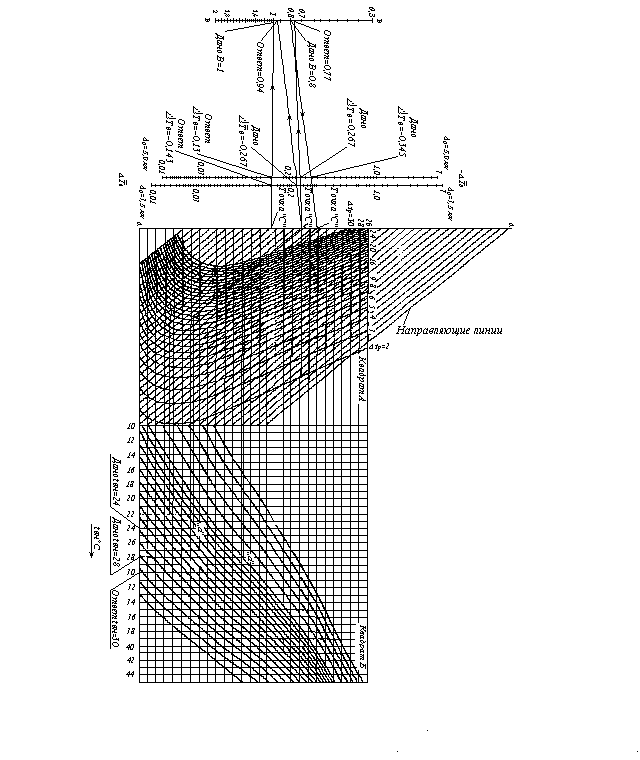 12. С помощью уравнений, приведенных в табл. 1, следует решать как прямые, так и обратные задачи. Целью прямых задач является определение поверхности охлаждения теплообменников при известных начальных параметрах воздуха, поступающего в приточный и испарительный кондиционеры, и при заданной глубине охлаждения приточного воздуха. Целью обратной задачи является определение глубины охлаждения воздуха в БСКВ при известных начальных параметрах воздуха, поступающего в приточный и испарительный кондиционеры, и известных поверхностях охлаждения теплообменников. 13. Для облегчения расчетов по уравнениям в табл. 1 приводится расчетный график на рис. 10.