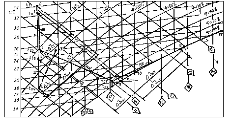 Рис. 13. Графическая интерпретация расчетных зависимостей при работе испарительного кондиционера на вытяжном воздухе из технологических помещений tн –