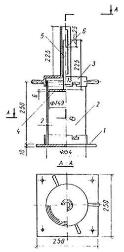 Рис. 3. Прибор для определения жесткости известково-песчаной бетонной смеси 1 - плита; 2 - цилиндр; 3 - крышка; 4 - диск; 5 - штанга; 6 - стрелка 3. Виброплощадка должна иметь устройства, обеспечивающие при испытании бетонной смеси жесткое крепление прибора к поверхности стола виброплощадки. 4. Цилиндр прибора изготовляют из листовой стали. Внутренняя сторона цилиндра должна иметь гладкую поверхность, степень шероховатости которой не должна быть более 40 мк. 5. Общая масса диска 4 и штанги 5 со стрелкой-указателем 6 прибора должна составлять 1750±50 г. 6. Определение жесткости бетонной смеси производят следующим образом: вначале очищают и протирают влажной тканью все соприкасающиеся с бетонной смесью поверхности прибора; прибор устанавливают на виброплощадку и жестко закрепляют опорную плиту 1, на которой крепят цилиндр 2; цилиндр заполняют бетонной смесью путем свободного засыпания ее кельмой с высоты 1 - 5 см; избыток смеси срезают металлической линейкой вровень с верхними краями цилиндра; на уложенную в цилиндре смесь устанавливают диск прибора 4 со штангой 5, проходящей через крышку 3, затем крышку закрепляют на цилиндре. После этого одновременно включают виброплощадку и секундомер и наблюдают за уплотнением смеси в цилиндре по перемещению стрелки-указателя 6 в прорези вертикальной части крышки прибора; бетонную смесь вибрируют в цилиндре до полного ее уплотнения, которое определяется прекращением перемещения стрелки-указателя. В момент полного уплотнения смеси выключают виброплощадку и секундомер. Полученное время, с, от начала до конца уплотнения характеризует жесткость бетонной смеси. жесткость бетонной смеси вычисляют с точностью до 1 с как среднее арифметическое результатов двух определений жесткости из одной пробы смеси, отличающихся между собой не более чем на 20%; при большем расхождении результатов определения повторяют. |