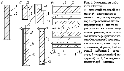 3.3. Панели-перегородки зданий из арболита, как правило, должны проектироваться однослойными. Для повышения их несущей способности (при воздействии на них транспортных и монтажных нагрузок) они должны проектироваться с боковыми железобетонными гранями из тяжелого или мелкозернистого бетона класса по прочности на сжатие В15–В25 (рис. 1, г). 3.4. Для плит покрытий и перекрытий арболит применяется в сочетании с тяжелым, легким или мелкозернистым бетоном класса по прочности на сжатие В15-В25, в котором должна располагаться рабочая арматура. Конструктивные решения таких элементов приведены на рис. 1, д-з. Толщина защитного слоя бетона в конструкциях составного сечения должна приниматься в соответствии с нормами проектирования бетонных и железобетонных конструкций. 3.5. В конструкциях плит покрытий и перекрытий во всех случаях в сжатой зоне должен предусматриваться слой толщиной не менее 20 мм из тяжелого, легкого или мелкозернистого бетона. Класс арболита по прочности на сжатие принимается в пределах В1,5-В3,5 в зависимости от типа конструкций. 3.6. Плиты перекрытий зданий, как правило, должны проектироваться в виде трехслойных элементов (рис. 1, д). Толщину нижнего железобетонного слоя следует принимать из условия расположения в нем арматуры с обеспечением необходимых защитных слоев. Толщина верхнего бетонного слоя должна назначаться исходя из расчета на прочность плит (см. п. 3.39). Класс арболита по прочности на сжатие для таких плит должен приниматься не менее В2. В случае если совместная работа слоя в трехслойных конструкциях перекрытий не обеспечивается (см. п. 3.40), плиты перекрытий должны проектироваться с боковыми несущими гранями (рис. 1, е). Ширина боковых граней принимается из условий размещения рабочей арматуры в бетоне с обеспечением необходимых защитных слоев при изготовлении элементов. Допускается рабочую арматуру в плитах перекрытий располагать в бетонных брусках или вкладышах (рис. 1, ж). Примечание: Плиты перекрытий с боковыми несущими гранями, а также панели-перегородки с железобетонными гранями (п. 3.3) допускается изготовлять в следующем порядке. В подготовленную форму к продольным ребрам закрепляются съемные инвентарные вкладыши на всю длину элемента. После укладки и уплотнения арболита борта форму закрывают, вкладыши удаляются, и борта вновь закрывают. В образовавшиеся продольные пазы укладывают арматурные каркасы, и пазы заполняют бетонной смесью. 3.7. Плиты покрытий зданий следует проектировать ребристыми (рис. 1, з). Толщина арболитового слоя в таких плитах назначается исходя из теплотехнического расчета. Высота ребер назначается из условия обеспечения достаточной жесткости плит. Арматура в верхнем слое не предусматривается. 3.8. Монтажные (подъемные) петли для всех видов конструкций из арболита следует выполнять в соответствии с действующим ГОСТ на легкобетонные изделия. В однослойные элементы подъемные петли закладывают на глубину не менее 50 диаметров стержня; при этом на концах заделываемые подъемные петли должны иметь крюки, заводимые за арматурные элементы (сетки) или приваренные стержни, пластины и т.д. Подъемные петли в элементах составных сечений должны быть заанкерены в бетонных слоях или в бетонных несущих гранях и во всех случаях заведены за арматурные каркасы или сетки. Стальные закладные изделия, а