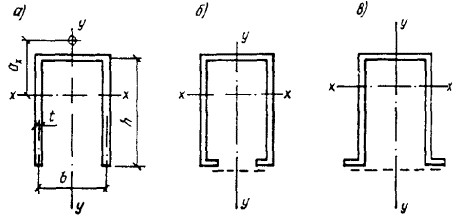 где β = b / h. Рис. 1. П-образные сечения элементов а - открытое; б, в - укрепленные планками или решеткой Таблица 7