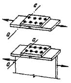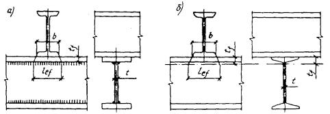 где N - усилие в одной ветви стержня; А - площадь сечения одной ветви; Ad - площадь сечения одного раскоса; α - коэффициент, определяемый по формуле α = al2 / (a3 + 2b3), (27) где а, l и b - размеры, указанные на рис. 4. 5.11. Расчет стержней, предназначенных для уменьшения расчетной длины сжатых элементов, должен выполняться на усилие, равное условной поперечной силе в основном сжатом элементе, определяемой по формуле (23)*. ИЗГИБАЕМЫЕ ЭЛЕМЕНТЫ5.12. Расчет на прочность элементов (кроме балок с гибкой стенкой, с перфорированной стенкой и подкрановых балок), изгибаемых в одной из главных плоскостей, следует выполнять по формуле Значения касательных напряжений τ в сечениях изгибаемых элементов должны удовлетворять условию При наличии ослабления стенки отверстиями для болтов значения τ в формуле (29) следует умножать на коэффициент α, определяемый по формуле α = a / (a - d), (30) где а - шаг отверстий; d - диаметр отверстия. 5.13. Для расчета на прочность стенки балки в местах приложения нагрузки к верхнему поясу, а также в опорных сечениях балки, не укрепленных ребрами жесткости, следует определять местное напряжение σloc по формуле где F - расчетное значение нагрузки (силы); lef - условная длина распределения нагрузки, определяемая в зависимости от условий опирания; для случая опирания по рис. 5 lef = b + 2tf, (32) где tf - толщина верхнего пояса балки, если нижняя балка сварная (рис 5, а), или расстояние от наружной грани полки до начала внутреннего закругления стенки, если нижняя балка прокатная (рис 5, б). Рис. 4. Схема крестовой решетки с распорками Рис. 5. Схемы для определения длины распределения нагрузки на балку а - сварную; б - прокатную 5.14*. Для стенок балок, рассчитываемых по формуле (28), должны выполняться условия где σу - то же, перпендикулярные оси балки, в том числе σloc, определяемое по формуле (31); τху - касательное напряжение, вычисляемое по формуле (29) с учетом формулы (30). Напряжения σх и σу, принимаемые в формуле (33) со своими знаками, а также τxy следует определять в одной и той же точке балки. 5.15. Расчет на устойчивость балок двутаврового сечения, изгибаемых в плоскости стенки и удовлетворяющих требованиям пп. 5.12 и 5.14*, следует выполнять по формуле где Wc - следует определять для сжатого пояса; φb - коэффициент, определяемый по прил. 7*. При определении значения φb за расчетную длину балки lef следует принимать расстояние между точками закреплений сжатого пояса от поперечных смещений (узлами продольных или поперечных связей, точками крепления жесткого настила); при отсутствии связей lef = l (где l - пролет балки) за расчетную длину консоли следует принимать lef = l при отсутствии закрепления сжатого пояса на конце консоли в горизонтальной плоскости (здесь l - длина консоли); расстояние между точками закреплений сжатого пояса в горизонтальной плоскости при закреплении пояса на конце и по длине консоли. 5.16*. Устойчивость балок не требуется проверять: а) при передаче нагрузки через сплошной жесткий настил, непрерывно опирающийся на сжатый пояс балки и надежно с ним связанный (плиты железобетонные из тяжелого, легкого и ячеистого бетона, плоский и профилированный металлический настил, волнистую сталь и т.п.); б) при отношении расчетной длины балки lef к ширине сжатого пояса b, не превышающем значений, определяемых по формулам табл. 8* для балок симметричного двутаврового сечения и с более развитым сжа