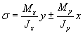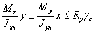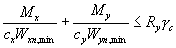 Обозначения, принятые в табл. 8*: b и t - соответственно ширина и толщина сжатого пояса; h - расстояние (высота) между осями поясных листов. Примечания. 1. Для балок с поясными соединениями на высокопрочных болтах значения lef / b, получаемые по формулам табл. 8* следует умножать на коэффициент 1,2. 2. Для балок с отношением b / t < 15 в формулах табл. 8* следует принимать b / t = 15. Закрепление сжатого пояса в горизонтальной плоскости должно быть рассчитано на фактическую или условную поперечную силу. При этом условную поперечную силу следует определять: при закреплении в отдельных точках по формуле (23)*, в которой φ следует определять при гибкости λ = lef / i (здесь i - радиус инерции сечения сжатого пояса в горизонтальной плоскости), а N следует вычислять по формуле N = (Af + 0,25 Aw) Ry; (37, а) при непрерывном закреплении по формуле qfic = 3Qfic / l, (37, б) где qfic - условная поперечная сила на единицу длины пояса балки; Qfic - условная поперечная сила, определяемая по формуле (23)*, в которой следует принимать φ = 1, а N - определять по формуле (37, а). 5.17. Расчет на прочность элементов, изгибаемых в двух главных плоскостях, следует выполнять по формуле где x и у - координаты рассматриваемой точки сечения относительно главных осей. В балках, рассчитываемых по формуле (38), значения напряжений в стенке балки должны быть проверены по формулам (29) и (33) в двух главных плоскостях изгиба. При выполнении требований п. 5.16*, а проверка устойчивости балок, изгибаемых в двух плоскостях, не требуется. 5.18*. Расчет на прочность разрезных балок сплошного сечения из стали с пределом текучести до 530 МПа (5400 кгс/см2), несущих статическую нагрузку, при соблюдении пп. 5.19*-5.21, 7.5 и 7.24 следует выполнять с учетом развития пластических деформаций по формулам: при изгибе в одной из главных плоскостей при касательных напряжениях τ ≤ 0,9Rs (кроме опорных сечений) при изгибе в двух главных плоскостях при касательных напряжениях τ ≤ 0,5Rs (кроме опорных сечений) здесь М, Мх и My - абсолютные значения изгибающих моментов; c1 - коэффициент, определяемый по формулам (42) и (43); сх и су - коэффициенты, принимаемые по табл. 66. Расчет в опорном сечении балок (при М = 0; Мх = 0 и My = 0) следует выполнять по формуле