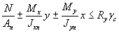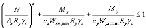 здесь Mef - условный изгибающий момент, равный: а) в неразрезных балках со свободно опертыми концами большему из значений Мef = 0,5М2, (48) где символ max означает, что следует найти максимум всего следующего за ним выражения; М1 - изгибающий момент в крайнем пролете, вычисленный как в свободно опертой однопролетной балке; M2 - максимальный изгибающий момент в промежуточном пролете, вычисленный как в свободно опертой однопролетной балке; α - расстояние от сечения, в котором действует момент M1, до крайней опоры; l - длина крайнего пролета; б) в однопролетных и неразрезных балках с защемленными концами Mef = 0,5M3, где М3 - наибольший из моментов, вычисленных как в балках с шарнирами на опорах; в) в балке с одним защемленным и другим свободно опертым концом значение Mef следует определять по формуле (47). Расчетное значение поперечной силы Q в формуле (44) следует принимать в месте действия Мтах. Если Мтах - момент в пролете, следует проверить опорное сечение балки. 5.23. Расчет на прочность неразрезных и защемленных балок, удовлетворяющих требованиям п. 5.22, в случае изгиба в двух главных плоскостях при τ ≤ 0,5Rs следует производить по формуле (40) с учетом перераспределения опорных и пролетных моментов в двух главных плоскостях согласно требованиям п. 5.22. ЭЛЕМЕНТЫ, ПОДВЕРЖЕННЫЕ ДЕЙСТВИЮ ОСЕВОЙ СИЛЫ С ИЗГИБОМ5.24*. Расчет на прочность внецентренно-сжатых и сжато-изгибаемых элементов по формуле (49) выполнять не требуется при значении приведенного эксцентриситета mef ≤ 20, отсутствии ослабления сечения и одинаковых значениях изгибающих моментов, принимаемых в расчетах на прочность и устойчивость. 5.25*. Расчет на прочность внецентренно-сжатых, сжато-изгибаемых, внецентренно-растянутых и растянуто-изгибаемых элементов из стали с пределом текучести до 530 МПа (5400 кгс/см2), не подвергающихся непосредственному воздействию динамических нагрузок, при τ ≤ 0,5Rs и N / (AnRy) > 0,1 следует выполнять по формуле где N, Мх и My - абсолютные значения соответственно продольной силы и изгибающих моментов при наиболее неблагоприятном их сочетании; п, сх и cу - коэффициенты, принимаемые по прил. 5. Если N / (AnRy) ≤ 0,1, формулу (49) следует применять при выполнении требований пп. 7.5 и 7.24. В прочих случаях расчет следует выполнять по формуле