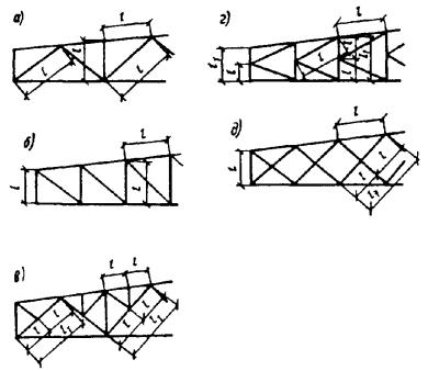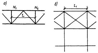 Обозначения, принятые в табл. 11 (рис. 7): l - геометрическая длина элемента (расстояние между центрами узлов) в плоскости фермы; l1 - расстояние между узлами, закрепленными от смешения из плоскости фермы (поясами ферм, специальными связями, жесткими плитами покрытий, прикрепленными к поясу сварными швами или болтами, и т.п.). Рис. 7. Схемы решеток ферм для определения расчетных длин элементов а - треугольная со стойками; б - раскосная; в - треугольная со шпренгелем; г - полураскосная треугольная; д - перекрестная 6.3*. Расчетные длины lef элементов перекрестной решетки, скрепленных между собой (рис. 7, д), следует принимать: в плоскости фермы - равными расстоянию от центра узла фермы до точки их пересечения (lef = l); из плоскости фермы: для сжатых элементов - по табл. 12; для растянутых элементов - равными полной геометрической длине элемента (lef = l1). Рис. 8. Схемы для определения расчетной длины пояса фермы из плоскости а - схема фермы; б - схема связей между фермами (вид сверху) Таблица 12