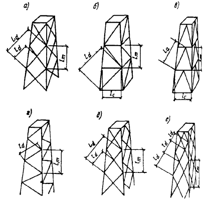 Обозначения, принятые в табл. 13* (рис. 9*): ldc - условная длина раскоса, принимаемая по табл. 14*; μd - коэффициент расчетной длины раскоса, принимаемый по табл. 15*. Примечания: 1. Раскосы по рис. 9*, а, д, е в точках пересечения должны быть скреплены между собой. 2. Для раскосов по рис. 9*, е необходима дополнительная проверка их из плоскости грани с учетом расчета по деформированной схеме. 3. Значение lef для распорок по рис 9*, в дано для равнополочных уголков. Рис. 9*. Схемы пространственных решетчатых конструкций а, б, в - с совмещенными в смежных гранях узлами; г, д, е - с несовмещенными в смежных гранях узлами Расчетные длины lef и радиусы инерции i растянутых элементов из одиночных уголков при определении гибкости следует принимать: для поясов - по табл. 13*; для перекрестных раскосов по рис. 9*, а, д, е: в плоскости грани - равными длине ld и радиусу инерции imin; из плоскости грани - полной геометрической длине раскоса Ld, равной расстоянию между узлами прикрепления к поясам, и радиусу инерции ix относительно оси, параллельной плоскости грани; для раскосов по рис. 9*, б, в, г - равными длине ld и радиусу инерции imin. Расчетные длины lef и радиус инерции i элементов из труб или парных уголков следует принимать согласно требованиям подраздела «Расчетные длины элементов плоских ферм и связей». Таблица 14*
