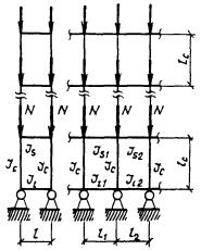 Обозначение, принятое в табл. 17: l - геометрическая длина элемента (расстояние между узлами структурной конструкции). для несвободных рам по формуле В формуле (70, в) p и n принимаются равными: в одноэтажной раме: в многоэтажной раме: для верхнего этажа p = 0,5 (p1 + p2); п = п1 + n2; « среднего « p = 0,5 (p1 + p2); n = 0,5 (n1 + n2); « нижнего « p = p1 + p2; n = 0,5 (n1 + n2), где p1; p2; n1; n2 следует определять по табл. 17, а. Для одноэтажных рам в формуле (69) и многоэтажных в формулах (70, а, б, в) при шарнирном креплении нижних или верхних ригелей к колоннам принимаются р = 0 или п = 0 (Ji = 0 или Js = 0), при жестком креплении р = 50 или п = 50 (Ji = ∞ или Js = ∞). При отношении H / B > 6 (где H - полная высота многоэтажной рамы, В - ширина рамы) должна быть проверена общая устойчивость рамы в целом как составного стержня, защемленного в основании. Примечание. Рама считается свободной (несвободной), если узел крепления ригеля к колонне имеет (не имеет) свободу перемещения в направлении, перпендикулярном оси колонны в плоскости рамы. Коэффициент расчетной длины μ наиболее нагруженной колонны в плоскости одноэтажной свободной рамы здания при неравномерном нагружении верхних узлов и наличии жесткого диска покрытия или продольных связей по верху всех колонн следует определять по формуле где μ - коэффициент расчетной длины проверяемой колонны, вычисленный по табл. 17, а; Jc и Nc - соответственно момент инерции сечения и усилие в наиболее нагруженной колонне рассматриваемой рамы; ΣNi и ΣJi - соответственно сумма расчетных усилий и моментов инерции сечений всех колонн рассматриваемой рамы и четырех соседних рам (по две с каждой стороны); все усилия Ni следует находить при той же комбинации нагрузок, которая вызывает усилие в проверяемой колонне. Значения μef, вычисленные по формуле (71)* следует принимать не менее 0,7. 6.11*. Коэффициенты расчетной длины μ отдельных участков ступенчатых колонн в плоскости рамы следует определять согласно прил. 6. При определении коэффициентов расчетной длины μ для ступенчатых колонн рам одноэтажных производственных зданий разрешается: не учитывать влияние степени загружения и жесткости соседних колонн; определять расчетные длины колонн лишь для комбинации нагрузок, дающей наибольшие значения продольных сил на отдельных участках колонн, и получаемые значения μ использовать для других комбинаций нагрузок; для многопролетных рам (с числом пролетов два и более) при наличии жесткого диска покрытия или продольных связей, связывающих поверху все колонны и обеспечивающих пространственную работу сооружения, определять расчетные длины колонн как для стоек, неподвижно закрепленных на уровне ригелей; для одноступенчатых колонн при соблюдении условий l2/l1 ≤ 0,6 и N1/N2 ≥ 3 принимать значения μ по табл. 18. Таблица 17, а