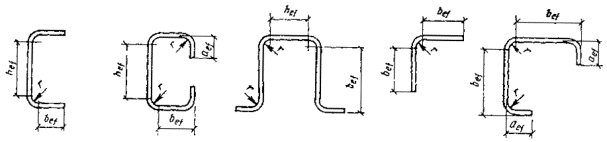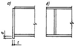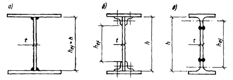 Примечания: 1. В конструкциях, не подвергающихся динамическим воздействиям, гибкость растянутых элементов следует проверять только в вертикальных плоскостях. 2. Гибкость растянутых элементов, подвергнутых предварительному напряжению, не ограничивается. 3. Для растянутых элементов, в которых при неблагоприятном расположении нагрузки может изменяться знак усилия, предельную гибкость следует принимать как для сжатых элементов, при этом соединительные прокладки в составных элементах необходимо устанавливать не реже чем через 40i. 4. Значения предельных гибкостей следует принимать при кранах групп режимов работы 7К (в цехах металлургических производств) и 8К по ГОСТ 25546-82. 5. К динамическим нагрузкам, приложенным непосредственно к конструкциям, относятся нагрузки, принимаемые в расчетах на выносливость или в расчетах с учетом коэффициентов динамичности. 7. ПРОВЕРКА УСТОЙЧИВОСТИ СТЕНОК И ПОЯСНЫХ ЛИСТОВ ИЗГИБАЕМЫХ И СЖАТЫХ ЭЛЕМЕНТОВСТЕНКИ БАЛОК7.1. Стенки балок для обеспечения их устойчивости следует укреплять: поперечными основными ребрами, поставленными на всю высоту стенки; поперечными основными и продольными ребрами; поперечными основными и промежуточными короткими ребрами и продольным ребром (при этом промежуточные короткие ребра следует располагать между сжатым поясом и продольным ребром). Прямоугольные отсеки стенки (пластинки), заключенные между поясами и соседними поперечными основными ребрами жесткости, следует рассчитывать на устойчивость. При этом расчетными размерами проверяемой пластинки являются: a - расстояние между осями поперечных основных ребер; hеf - расчетная высота стенки (рис. 10), равная в сварных балках полной высоте стенки, в балках с поясными соединениями на высокопрочных болтах - расстоянию между ближайшими к оси балки краями поясных уголков, в балках, составленных из прокатных профилей, - расстоянию между началами внутренних закруглений, в гнутых профилях (рис. 11) - расстоянию между краями выкружек; t - толщина стенки. Рис. 10. Расчетная высота стенки составной балки а - сварной из листов; б - на высокопрочных болтах; в - сварной с таврами Рис. 11. Схемы поперечных сечений гнутых профилей 7.2*. Расчет на устойчивость стенок балок следует выполнять с учетом всех компонентов напряженного состояния (σ, τ и σloc). Напряжения σ, τ и σloc следует вычислять в предположении упругой работы материала по сечению брутто без учета коэффициента φb. Сжимающее напряжение σ у расчетной границы стенки, принимаемое со знаком «плюс», и среднее касательное напряжение τ следует вычислять по формулам: