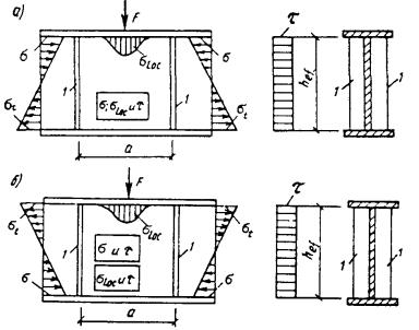Рис. 12. Схема балки, укрепленной поперечными основными ребрами жесткости (1) а - сосредоточенная нагрузка F приложена к сжатому поясу; б - то же, к растянутому поясу где c1 - коэффициент, принимаемый для сварных балок по табл. 23 в зависимости от отношения a / hef и значения δ, вычисляемого по формуле (77), а для балок на высокопрочных болтах - по табл. 23, а;