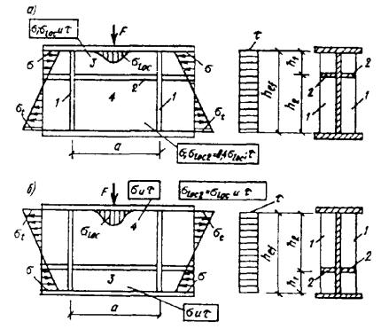 Рис. 13. Схема балки, укрепленной поперечными основными ребрами и продольным ребром жесткости a - сосредоточенная нагрузка F приложена к сжатому поясу; б - то же, к растянутому; 1 - поперечное основное ребро жесткости; 2 - продольное ребро жесткости; 3 - пластинка у сжатого пояса; 4 - пластинка у растянутого пояса Значения σcr1 и σloc,cr1 следует определять по формулам: при σloc = 0 где