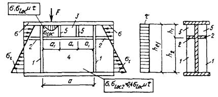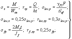 где h - полная высота стенки; M и Q - средние значения соответственно момента и поперечной силы в пределах отсека; если длина отсека больше его расчетной высоты, то M и Q следует вычислять для более напряженного участка с длиной, равной высоте отсека; если в пределах отсека момент или поперечная сила меняют знак, то их средние значения следует вычислять на участке отсека с одним знаком. Местное напряжение σloc в стенке под сосредоточенной нагрузкой следует определять согласно требованиям пп. 5.13 и 13.34* (при γf1 = 1,1) настоящих норм. В отсеках, где сосредоточенная нагрузка приложена к растянутому поясу, одновременно должны быть учтены только два компонента напряженного состояния: σ и τ или σloc и τ. Односторонние поясные швы следует применять в