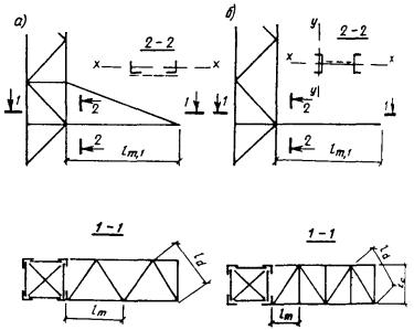 Примечание. Указанные в таблице коэффициенты условий работы не распространяются на соединения элементов в узлах. 15.6. Расчет на устойчивость внецентренно-сжатых и сжато-изгибаемых стержней сквозного сечения, постоянного по длине, следует выполнять согласно требованиям разд. 5 настоящих норм. Рис. 21. Схемы траверс а - с треугольной решеткой; б - то же, со стойками Для равносторонних трехгранных стержней сквозного сечения, постоянного по длине, с решетками и планками относительный эксцентриситет т следует вычислять по формулам: при изгибе в плоскости, перпендикулярной одной из граней т = 3,48βM / (Nb); (152) при изгибе в плоскости, параллельной одной из граней т = 3βM / (Nb), (153) где b - расстояние между осями поясов в плоскости грани; β - коэффициент, равный 1,2 при болтовых соединениях и 1,0 - при сварных соединениях. 15.7. При расчете внецентренно-сжатых и сжато-изгибаемых стержней сквозного сечения согласно требованиям п. 5.27* настоящих норм значение эксцентриситета при болтовых соединениях элементов следует умножать на коэффициент 1,2. 15.8. При проверке устойчивости отдельных поясов внецентренно-сжатых и сжато-изгибаемых стоек сквозного сечения опор с оттяжками продольную силу в каждом поясе следует определять с учетом усилия от изгибающего момента М, вычисляемого по деформированной схеме. Значение этого момента в середине длины шарнирно-опертой стойки должно определяться по формуле где Mq - изгибающий момент в середине длины от поперечной нагрузки, определяемый как в обычных балках; δ = 1 - 0,1Nl2 / (EJ); здесь J - момент инерции сечения стойки относительно оси, перпендикулярной плоскости действия поперечной нагрузки; l - длина стойки; N - продольная сила в стойке; fq - прогиб стойки в середине длины от поперечной нагрузки, определяемый как в обычных балках; f0 = l / 750 - стрелка начального искривления стойки; β - коэффициент, принимаемый согласно п. 15.6. 15.9. Поперечную силу Q в сжато-изгибаемых и шарнирно-опертых стойках сквозного сечения, постоянного по длине, в опорах с оттяжками следует принимать постоянной по длине стойки и определять по формуле где Qmax - максимальная поперечная сила от внешней нагрузки. Остальные обозначения в формуле (155) приняты такими, как в формуле (154). 15.10*. Расчет на устойчивость сжатых стержней конструкций из одиночных уголков следует выполнять, как правило, с учетом эксцентричного приложения продольных сил. Допускается рассчитывать эти стержни как центрально-сжатые по формуле (7) при условии умножения продольных сил на коэффициенты αm и αd, принимаемые не менее 1,0. В пространственных болтовых конструкциях по рис. 9* (кроме рис. 9*, в и концевых опор) при центрировании в узлах стержней из одиночных равнополочных уголков по их рискам при однорядном расположении болтов в элементах решетки и прикреплении раскосов в узле с двух сторон полки пояса значения коэффициентов αm и αd определяются: для поясов с при 0,55 ≤ c / b ≤ 0,66 и Nmd / Nm ≤ 0,7 αm = 1+ [c