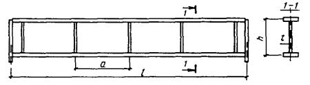 Расчет на выносливость элементов, подверженных двухосному растяжению, допускается производить более точными методами с учетом фактического напряженного состояния. 17.5. Плоские облицовки затворных камер и водоводов следует рассчитывать на прочность при: давлении свежеуложенного бетона и цементного раствора, инъектируемого за облицовку; фильтрационном давлении воды в заоблицовочном бетоне с учетом давления воды в водоводе. 17.6. Рабочие пути под колесные и катковые затворы следует рассчитывать на прочность при изгибе и местном смятии поверхностей катания, при местном сжатии стенки, при сжатии бетона под подошвой. 17.7. Трубопроводы с изменяющимися по длине диаметрами должны быть разделены на участки с постоянным диаметром. Переход от одного диаметра трубы к другому должен выполняться коническими обечайками или звеньями. 18. ДОПОЛНИТЕЛЬНЫЕ ТРЕБОВАНИЯ ПО ПРОЕКТИРОВАНИЮ БАЛОК С ГИБКОЙ СТЕНКОЙ18.1*. Для разрезных балок с гибкой стенкой симметричного двутаврового сечения, несущих статическую нагрузку и изгибаемых в плоскости стенки, следует, как правило, применять стали с пределом текучести до 430 МПа (4400 кгс/см2). Рис. 22. Схема балки с гибкой стенкой 18.2*. Прочность