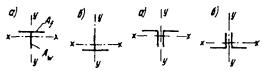 где α = αx / h - относительное расстояние между центром тяжести и центром изгиба. Здесь Jω - секториальный момент инерции сечения; bi и ti - соответственно ширина и толщина прямоугольных элементов, составляющих сечение. Для сечения, приведенного на рис. 1, а, значения