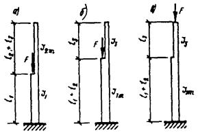 Рис. 26. Схемы одноступенчатых колонн (к табл. 71) а - сила F приложена к нижнему участку колонны; б - то же, к среднему участку; в - то же, к верхнему участку Таблица 71 Коэффициенты расчетной длины μm1, μm2, μm3