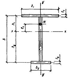 где а - расстояние от главной оси сечения, перпендикулярной плоскости изгиба, до оси наиболее сжатой ветви, но не менее расстояния до оси стенки ветви. При вычислении эксцентриситета е = M / N значения М и N следует принимать согласно требованиям п. 5.29. Расчет на устойчивость внецентренно-сжатых и сжато-изгибаемых трехгранных сквозных стержней с решетками или планками и постоянным по длине равносторонним сечением следует выполнять согласно требованиям разд. 15*. Расчет на устойчивость не требуется для сплошностенчатых стержней при mef > 20 и для сквозных стержней при m > 20, в этих случаях расчет следует выполнять как для изгибаемых элементов. 5.28*. Внецентренно-сжатые элементы, выполненные из стали с пределом текучести свыше 530 МПа (5400 кгс/см2) и имеющие резко несимметричные сечения (типы сечений 10 и 11 по табл. 73), кроме расчета по формуле (51), должны быть проверены на прочность по формуле