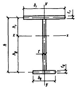 где обозначено: для сварных двутавров: t - толщина стенки; bf u t1 - ширина и толщина пояса балки; h - расстояние между осями поясов; а - размер, равный 0,5h; для двутавровых балок с поясными соединениями на высокопрочных болтах: t - сумма толщин стенки и вертикальных поясных уголков; bf - ширина листов пояса; t1 - сумма толщин листов пояса и горизонтальной полки поясного уголка; h - расстояние между осями пакета поясных листов; а - ширина вертикальной полки поясного уголка за вычетом толщины горизонтальной полки. Значение коэффициента φb в формуле (34) необходимо принимать: при φ1 ≤ 0,85 φb = φ1; при φ1 > 0,85 φb = 0,68 + 0,21φ1, но не более 1,0. 2. Для балок двутаврового сечения с одной осью симметрии (рис. 28) для определения коэффициента φb необходимо вычислить коэффициенты φ1 и φ2 по формулам: