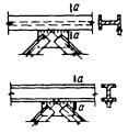 ребра жесткости и полосы стенки шириной 0,65t Нижние торцы опорных ребер (рис. 15) должны быть остроганы либо плотно пригнаны или приварены к нижнему поясу балки. Напряжения в этих сечениях при действии опорной реакции не должны превышать: в первом случае (рис. 15, а) - расчетного сопротивления прокатной стали смятию Rp при а ≤ 1,5t и сжатию Ry при а > 1,5t; во втором случае (рис. 15, б) - смятию Rp. Рис. 15. Схема устройства опорного ребра жесткости a - в торце с применением строжки; б - удаленного от торца с плотной пригонкой или приваркой к нижнему поясу В случае приварки опорного ребра к нижнему поясу балки сварные швы должны быть рассчитаны на воздействие опорной реакции. 7.13. Одностороннее