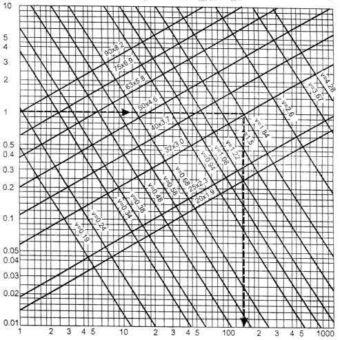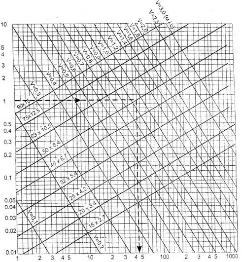 Примечание: Условное обозначение труб состоит из слов: труба PPRC, размера наружного диаметра и типа трубы. Пример условного обозначения трубы из PPRC на давление 20 кгс/см2 наружным диаметром 32 мм: труба PPRC 32PN20. 1.9. Трубы из PPRC поставляются в отрезках длиной до 4 м. 2. Проектирование трубопроводов2.1. Проектирование систем трубопроводов связано с выбором типа труб, соединительных деталей и арматуры, выполнением гидравлического расчета, выбором способа прокладки и условий, обеспечивающих компенсацию тепловых изменений длины трубы без перенапряжения материала и соединений трубопровода. Выбор типа трубы производится с учетом условий работы трубопровода: давления и температуры, необходимого срока службы и агрессивности транспортируемой жидкости. При транспортировке агрессивных жидкостей следует применять коэффициенты условия работы трубопровода согласно табл. 5 из СН 550-82. 2.2. Сортамент труб, соединительных деталей и арматуры приводится в прил. 3. 2.3. Гидравлический расчет трубопроводов из PPRC заключается в определении потерь напора на преодоление гидравлических сопротивлений, возникающих в трубе, в стыковых соединениях и соединительных деталях, в местах резких поворотов и изменений диаметра трубопровода. 2.4. Гидравлические потери напора в трубах определяются по номограммам рис. 2.1. и 2.2. Расход, л/сек. Потеря напора на трение, мм/м Рис. 2.1. Номограмма для инженерного гидравлического расчета холодного водопровода из труб PPRC (PN10) Пример определения: Дано: труба PPRC 32PN10, расход жидкости 1 л/сек По номограмме: средняя скорость течения жидкости 1,84 м/сек. потеря напора 140 мм/м Расход, л/сек. Потеря напора на трение, мм/м Рис. 2.2. Номограмма для инженерного гидравлического расчета холодного водопровода из труб PPRC (PN20) Пример определения: Дано: труба PPRC50 PN20, расход жидкости 1 л/сек По номограмме: средняя скорость течения жидкости 1,1 м/с, потеря напора 45 мм/м 2.5. Гидравлические потери напора в стыковых соединениях можно принять равными 10 - 15 % величины потерь напора в трубах, определенными по номограмме. Для внутренних водопроводных систем величину потерь напора на местные сопротивления, в соединительных деталях и арматуре рекомендуется принимать равной 30 % величины потерь напора в трубах. 2.6. Трубопроводы в зданиях прокладываются на подвесках, опорах и кронштейнах открыто или скрыто (внутри шахт, строительных конструкций, борозд, в каналах). Скрытая прокладка трубопроводов необходима для обеспечения защиты пластмассовых труб от механических повреждений. 2.7. Трубопроводы вне зданий (межцеховые или наружные) прокладываются на эстакадах и опорах (в обогреваемых или необогреваемых коробах и галереях или без них), в каналах (проходных или непроходных) и в грунте (бесканальная прокладка). 2.8. Запрещается прокладка технологических трубопроводов из PPRC в помещениях, относящихся по пожарной опасности к категориям А, Б, В. 2.9. Не допускается прокладка внутрицеховых технологических трубопроводов из пластмассовых труб через административные, бытовые и хозяйственные помещения, помещения электроустановок, щиты системы контроля и автоматики, лестничные клетки, коридоры и т.п. В местах возможного механического повреждения трубопровода следует применять только скрытую прокладку в бороздах, каналах и шахтах. 2.10. Теплоизоляция трубопроводов водоснабжения выполн