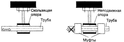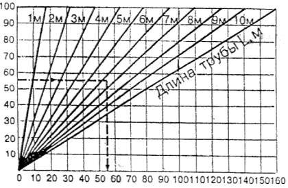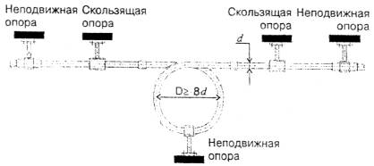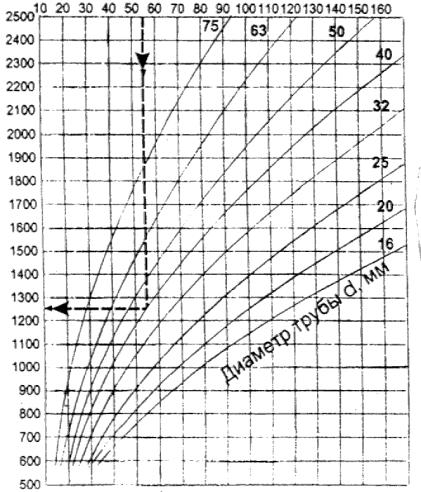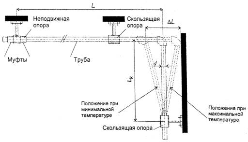 2.15. При проектировании вертикальных трубопроводов опоры устанавливаются не реже чем через 1000 мм для труб наружным диаметром до 32 мм и не реже чем через 1500 мм для труб большого диаметра. 2.16. Компенсирующие устройства выполняются в виде Г-образных элементов (рис. 2.4), П-образных (рис. 2.5) и петлеобразных (круговых) компенсаторов (рис. 2.6). Рис. 2.4. Г-образный элемент трубопровода Рис. 2.5. П-образный компенсатор Рис. 2.6. Петлеобразный компенсатор 2.17. Расчет компенсирующей способности Г-образных элементов (рис. 2.4) и П-образных компенсаторов (рис. 2.5) производится по номограмме (рис. 2.7) или по эмпирической формуле (2.2) где Lk - длина участка Г-образного элемента, воспринимающего температурные изменения длины трубопровода, мм; d - наружный диаметр трубы, мм; DL - температурные изменения длины трубы, мм. Величину Lk можно также определить по номограмме (рис. 2.7). Рис. 2.7. Номограмма для определения длины участка трубы, воспринимающего тепловое удлинение Пример: dн = 40 мм, DL = 55 мм По формуле 2.2 Lk = 25 По номограмме L = 1250 мм 2.18. Конструирование систем внутренних трубопроводов рекомендуется производить в следующей последовательности: - на схеме трубопроводов предварительно намечают места расположения неподвижных опор с учетом компенсации температурных изменений длины труб элементами трубопровода (отводами и пр.); - проверяют расчетом компенсирующую способность элементов трубопровода между неподвижными опорами; - намечают расположение скользящих опор с указанием расстояний между ними. 2.19. Неподвижные опоры необходимо размещать так, чтобы температурные изменения длины участка трубопровода между ними не превышали компенсирующей способности отводов и компенсаторов, расположенных на этом участке и распределялись пропорционально их компенсирующей способности. 2.20. В тех случаях, когда температурные изменения длины участка трубопровода превышают компенсирующую способность его элементов, на нем необходимо установить дополнительный компенсатор. 2.21. Компенсаторы устанавливаются на трубопроводе, как правило, посредине между неподвижными опорами, делящими трубопровод на участки, температурная деформация которых происходит независимо друг от друга. Компенсация линейных удлинений труб из PPRC может обеспечиваться также предварительным прогибом труб при прокладке их в виде «змейки» на сплошной опоре, ширина которой допускает возможность изменения формы прогиба трубопровода при изменении температуры. 2.22. При расстановке неподвижных опор следует учитывать, что перемещение трубы в плоскости перпендикулярно стене, ограничивается расстоянием от поверхности трубы до стены (рис. 2.4). Расстояние от неподвижных соединений до осей тройников должно быть не менее шести диаметров трубопровода. 2.23. Запорная и водоразборная арматура должна иметь неподвижное крепление к строительным конструкциям для того, чтобы усилия возникающие при пользовании арматурой, не передавались на трубы PPRC. 2.24. При прокладке в одном помещении нескольких трубопроводов из пластмассовых труб их следует укладывать совместно компактными пучками на общих опорах или подвесках. Трубопроводы в местах пересечения фундаментов зданий, перекрытий и перегородок должны проходить через гильзы, изготовленные, как правило, из стальных труб, концы которых должны выступать на 20 - 50 мм из пересекаемой по