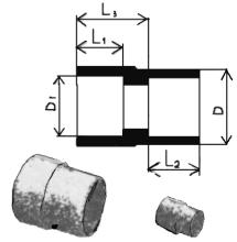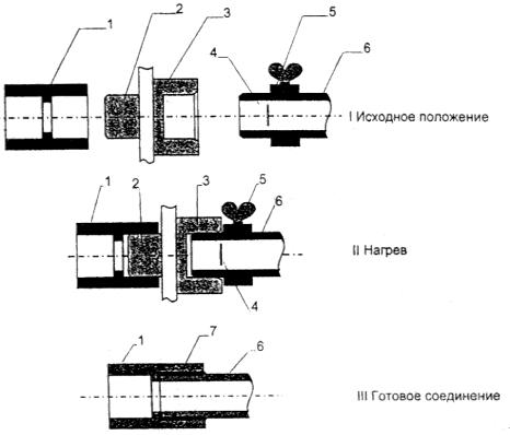 Рис. 4.1. Виды опор 4.8. Трубопровод из труб PPRC не должен примыкать вплотную к стене. Расстояние в свету между трубами и строительными конструкциями должно быть не менее 20 мм или определяться конструкцией опоры. 5. Соединение труб5.1. Основными способами соединений труб из PPRC при монтаже являются: - контактная сварка в раструб; - резьбовое соединение с металлическими трубопроводами; - соединение с накидной гайкой; - соединение на свободных фланцах. 5.2. Контактная сварка в раструб осуществляется при помощи нагревательного устройства (сварочный аппарат), состоящего из гильзы для оплавления наружной поверхности конца трубы и дорна для оплавления внутренней поверхности раструба соединительной детали или корпуса арматуры (рис. 5.1). Рис. 5.1. Последовательность процесса контактной сварки в раструб трубы и муфты из PPRC. 1 - муфта; 2 - дорн нагревательного устройства; 3 - гильза нагревательного устройства; 4 - метка на внешней поверхности конца трубы; 5 - ограничительный хомут; 6 - труба; 7 - сварной шов. 5.3. Контактная раструбная сварка включает следующие операции: - на сварочном аппарате (см. прил. 3) установить сменные нагреватели необходимого размера; - включить сварочный аппарат в электросеть, рабочая температура на поверхности сменных нагревателей (+260 °С) устанавливается автоматически. Сигналом готовности сварочного аппарата к работе является выключение сигнальной лампочки; - на конце трубы снять фаску под углом 30 град.; - конец трубы и раструб соединительной детали перед сваркой очистить от пыли и грязи и обезжирить; - на трубе нанести метку (или установить ограничительный хомут) на расстоянии от торца трубы до метки (или до края хомута), равном глубине раструба соединительной детали плюс 2 мм. Величина расстояния от торца трубы до метки для различных диаметров приведена в табл. 5.1. Таблица 5.1