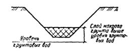 Рис.1. Расположение уровня грунтовых вод при высоте стояния, равной 0 м 12. При прокладке трубопроводов с искусственным водопонижением следует применять коэффициенты к стоимости земляных работ по табл. 89 (гр. «а», «ж»), табл. 90 и 91 (гр. «а», «г»), а стоимость водопонижения исчислять дополнительно на основании данных проектов организации строительства (ПОС) и действующих ЕРЕР. Коэффициенты по табл. 89 - 91 в зависимости от высоты, стояния грунтовых вод применяются ко всем графам укрупненных сметных норм, за исключением граф «Транспортирование грунта по базисному району». К затратам на транспортирование грунта при любой высоте стояния грунтовых вод применяются коэффициенты, приведенные для высоты стояния грунтовых вод, равной 0 м. 13. При прокладке трубопроводов в мокрых грунтах к стоимости колодцев, определенной по укрупненным сметным нормам для сухих грунтов, и стоимости местных материалов и конструкций, следует применять коэффициенты: для наружных сетей водоснабжения (включая колодцы на трубопроводах рабочих напорных диаметром до 400 мм - 1,27; более 400 мм - по примечанию к табл. 42; для наружных сетей канализации - 1,15 для круглых колодцев и 1,37 - для прямоугольных. 14. При глубине заложения трубопроводов до 2 м следует пользоваться таблицами укрупненных сметных норм для глубины заложения 2 м и применять к стоимости земляных работ следующие коэффициенты: Глубина заложения трубопровода Коэффициент 1,8 0,9 1,6 0,8 1,4 0,6 1,2 0,5 1 0,4 При этом затраты на укладку трубопроводов и устройство колодцев корректировке не подлежат. 15. При укладке двух и более трубопроводов в совмещенной траншее стоимость земляных работ для первого трубопровода следует принимать по данным соответствующих таблиц укрупненных сметных норм в полном объеме, а к стоимости земляных работ для второго и каждого последующего трубопровода применять следующие коэффициенты по табл. 1. Таблица 1