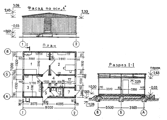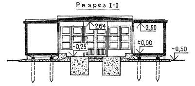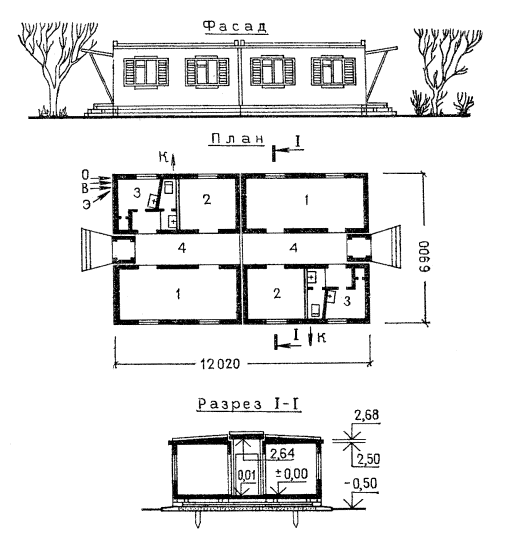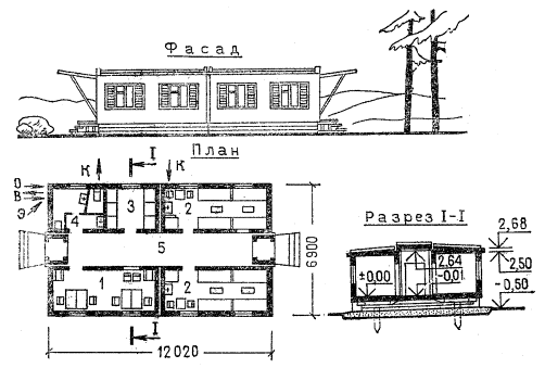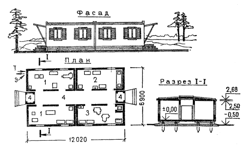 РАЙОННАЯ ЦЕНА № 3Одноэтажный жилой дом на четыре двухкомнатные квартиры с центральным отоплением от теплосети, водопроводом и канализацией. Здание деревянное контейнерного типа. Строительный объем здания-655,2 м3 (типовой проект 420-21-3)