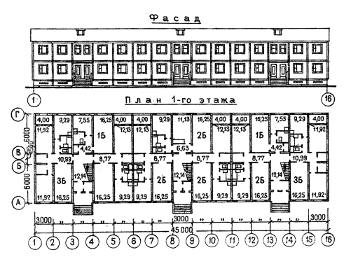 Рис. 8. 18-квартирный жилой дом с шестью однокомнатными квартирами, шестью двухкомнатными квартирами и шестью трехкомнатными квартирами жилой площадью 254,16 м2 и общей площадью 459,78 м2. Типовой проект 420-10-4 (к цене № 10) Масса кирпича строительного - 38,6 т Масса контейнеров - 270 т Масса элементов встроенных частей - 32 т Измеритель - 1 здание