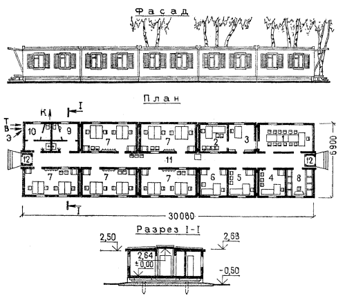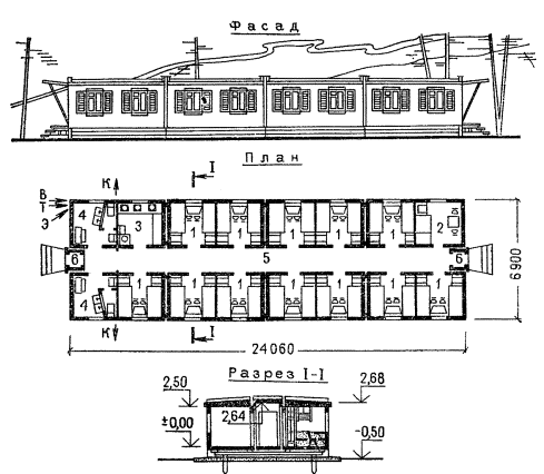 РАЙОННАЯ ЦЕНА № 15Общежитие на 50 чел. с центральным отоплением от теплосети, водопроводом и канализацией. Здание деревянное контейнерного типа. Строительный объем здания -1479,6 м3 (типовой проект 420-21-1)