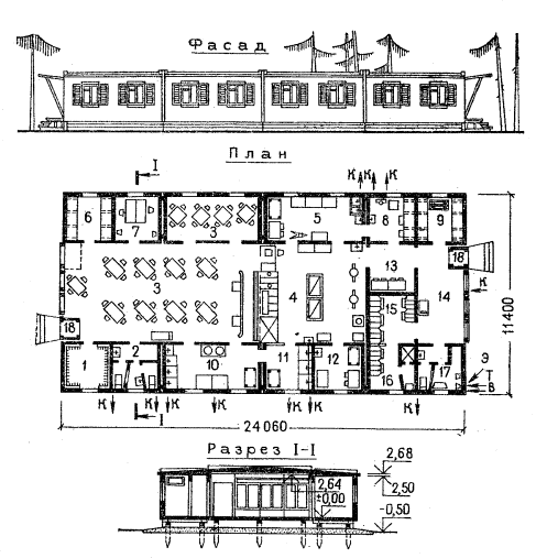 Рис. 19. Столовая на 50 посадочных мест. Типовой проект 420-04-16 (к цене № 21) 1 - гардероб; 2 - санузел; 3 - обеденный зал; 4 - кухня; 5 - мясо-рыбная и овощная; 6 - кладовая белья и инвентаря; 7 - контора столовой; 8 - кладовая овощей; 9 - кладовая сухих продуктов; 10 - моечная столовой посуды; 11 - моечная кухонной посуды; 12 - холодная заготовочная; 13 - холодильная; 14 - загрузочная и тарная; 15 - гардероб персонала; 16 - душевая и гардероб; 17 - санузел; комната персонала; 18 - тамбур Масса контейнеров - 41,4 т Масса элементов встроенных частей - 24,9 т Измеритель - 1 здание