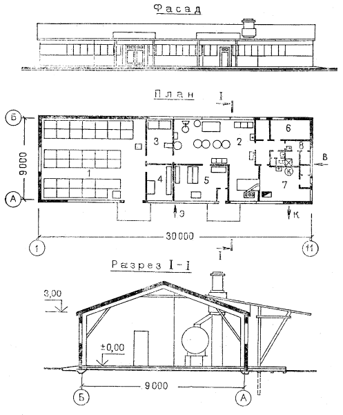16. Санитарно-технические и плотнично-столярные мастерские контейнерного типаРАЙОННАЯ ЦЕНА № 49Санитарно-техническая мастерская с жестяницким отделением с программой 30 тыс. руб. в год, с центральным отоплением от теплосети. Здание контейнерного типа с деревянным каркасом и стальной опорной рамой. Строительный объем здания - 621 м3 (типовой проект 420-04-3)