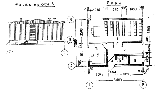 Рис. 26. Красный уголок. Типовой проект 494-4-08 (к цене № 31) 1 - комната совещаний; 2 - библиотека; 3 - вестибюль; 4 - тамбур; 5 - санузел; 6 - тепловой узел Масса кирпича строительного - 1,8 т Масса контейнеров - 18 т Измеритель - 1 здание