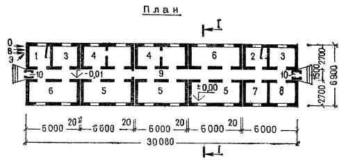 Рис. 12. Типовой проект 420-10-5 (к цене № 14) 1 - комнаты на 3 чел.; 2 - комнаты на 2 чел.; 3 - комната для занятий; 4 - комната отдыха; 5-комната обслуживающего персонала; 6 - кухня; 7 - комната принятия пищи; 8 - уборная; 9 - умывальная с душевой; 10 - постирочная; 11 - кладовая; 12 - тепловой узел; 13 - сушильная; 14 - камера хранения личных вещей; 15 - кладовая чистого белья; 16 - вестибюль; 17 - электрощитовая; 18 - коридоры; 19 - тамбуры; 20 - шлюзы Масса кирпича строительного - 18,8 т Масса контейнеров - 142 т Масса элементов встроенных частей - 18 т Измеритель - 1 здание