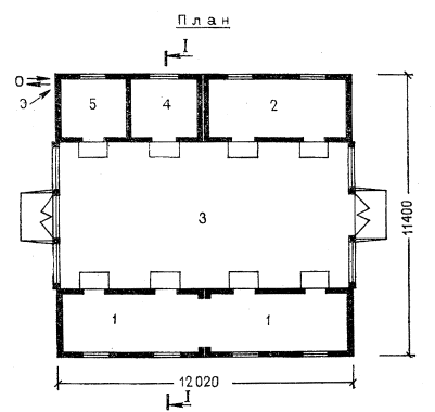 Рис. 35. Ремонтно-механическая мастерская с программой работ 40 тыс. руб. в год. Типовой проект 420-04-01 (к цене № 47) 1 - механический участок; 2 - слесарный участок; 3 - сборочно-разборочный участок; 4 - инструментальная кладовая; 5 - гардероб Измеритель - 1 здание