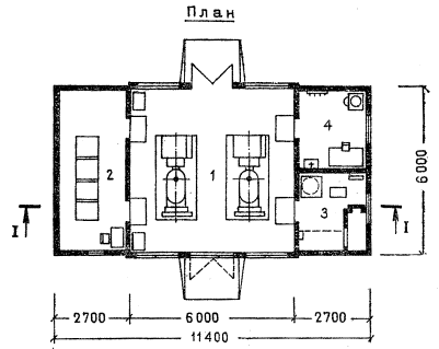 Рис. 1. Двухквартирный жилой дом. Типовой проект 420-04-14 (к цене № 1) 1 - жилая комната для семейных; 2 - жилая комната; 3 - кухня с санузлом; 4 - коридор и тамбур Строительный объем здания -249,1 м3 (типовой проект 420-04-14) Масса контейнеров - 21 т Масса элементов встроенных частей - 4,6 т Измеритель - 1 здание