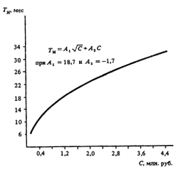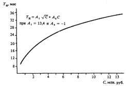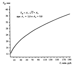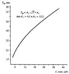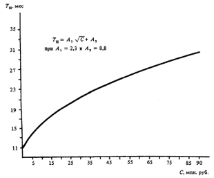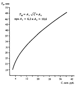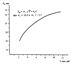 В формулах (3) - (5): С - объем строительно-монтажных работ, руб.; A1 и А2 параметры регрессионной кривой, определяемые методом наименьших квадратов. Для каждой отрасли и подотрасли выбрана кривая с минимальным среднеквадратичным отклонением, что позволило объединить виды и характер строительства в отраслевом разрезе в соответствии с функциональной зависимостью продолжительности строительства от стоимости СМР. Параметры A1 и A2 отражают специфические отраслевые особенности, конструктивные решения и структуру строительно-монтажных работ. Значения параметров A1 и A2 приведены на графиках, соответствующих каждой отрасли и подотрасли. 3.3. Для определения расчетным методом общей продолжительности строительства объектов в разделе "Организация строительства" проектов (рабочих проектов), а также в ТЭО (ТЭР), рекомендуется пользоваться графиками зависимостей нормативной продолжительности строительства от стоимости СМР, приведенными в приложении к настоящему Пособию. Указанные зависимости применяются без учета всех коэффициентов, приведенных в СНиП 1.04.03-85, и распространяются только на те интервалы объемов СМР по отраслям, подотраслям, видам производств и группам объектов, которые установлены в соответствующих графиках. 3.4. Задел в строительстве объектов при этом определяется на основе "Методических рекомендаций для разработки норм продолжительности строительства и задела в строительстве предприятий, зданий и сооружений", М., ЦНИИОМТП, 1984. Подготовительный период определяется исходя из объема подготовительных работ в пределах 15-25 % общей продолжительности строительства объекта, определенной расчетным методом. 3.5. Сроки передачи в монтаж и продолжительность монтажа технологического оборудования определяются с учетом наиболее эффективной организационно-технологической последовательности по графику, согласованному с монтажной организацией, генподрядчиком и заказчиком. Пусконаладочные работы входят в расчетную общую продолжительность строительства. 3.6. Стоимость СМР в графиках, зависимостях и таблицах приведена к центральному району европейской части страны в ценах, действующих с 1984 г. Определенная таким образом продолжительность строительства с достаточной степенью точности характеризует максимально необходимое время сооружения объектов с учетом экономической и социальной потребности в создании соответствующих основных фондов к заданным срокам. ПРИЛОЖЕНИЕ