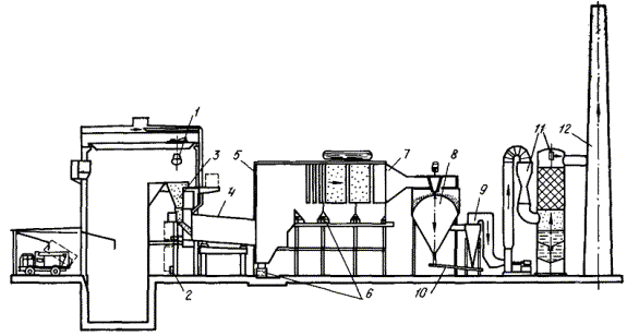 Черт. 2. Агрегат термического обезвреживания токсичных промышленных отходов (фирма «МАН» - ФРГ) 1 - разгрузка отходов; 2 - загрузка бочек; 3 - загрузка сыпучих отходов; 4 - печь с вращающимся барабаном; 5 - камера дожигания; 6 - котел-утилизатор; 7 - электрофильтр; 8 - скруббер Черт. 3. Схема станции сжигания промышленных отходов (фирма «ЧКД-Дукла» - ЧССР) 1 - бункер; 2 - мостовой кран; 3 - загрузочная воронка с гидравлическим подающим устройством; 4 - стабилизационная горелка; 5 - печь с вращающимся барабаном; 6 - выход перегретого пара; 7 - пароперегреватель; 8 - камера дожигания; 9 - водоподогреватель; 10 - электрофильтр; 11 - дымосос; 12 - дымовая труба; 13 - транспортный шнек; 14 - транспортный бункер; 15 - мокрое устройство для удаления шлака Торцевые откосы должны быть с заложением 1:3; 1:4 с учетом возможности заезда машин и механизмов при строительстве, боковые откосы - крутыми, назначаются исходя из их устойчивости и конструкции экрана. 3.42. Дно карт следует проектировать с уклоном по длине. Закладку отходов необходимо начинать с торца, с наиболее высокой отметки дна. В карте, где производится прием отходов, дно целесообразно разделить на два или три отсека дамбочками из глины или суглинка высотой 1,0 м, позволяющими разделить дождевые воды на чистые и загрязненные. После дождя стоки со дна карты необходимо перекачивать передвижными насосами: чистые - в дождевую сеть полигона, загрязненные (контактирующие с отходами) - в автоцистерну с транспортировкой на завод по обезвреживанию отходов. При наличии пластового дренажа под экраном карт поверхности днища необходимо придать также поперечный уклон к оси карты, повторяющий уклон пластового дренажа. 3.43. Подготовленное основание карт перед устройством экрана или пластового дренажа под экран должно иметь несущую способность не менее 0,1 МПа (1,0 кг/см2). При прохождении дождя на подготовленное основание карты воду необходимо откачать. После естественной подсушки основание повторно выравнивается и укладывается. 3.44. В табл. 2 СНиП 2.01.28-85 в знаменателе дан расход вяжущих, кг/м2, для поверхностной обработки и закрепления грунта при консервации отходов в картах; показатель в числителе применяется для улучшения противофильтрационных свойств грунтовых экранов. 3.45. Строительство экрана карт необходимо вести в сухую погоду и, как правило, при положительной температуре. 3.46. При размещении полигона на подтопляемой территории в случае устройства под экранами пластового дренажа требование СНиП 2.01.28-85 п. 2.2 в части 2-метрового разрыва уровня грунтовых вод с дном карты исключается ввиду надежности защиты. 4. ОСОБЕННОСТИ ПРОЕКТИРОВАНИЯ ДОЖДЕВОЙ, ХОЗЯЙСТВЕННО-БЫТОВОЙ КАНАЛИЗАЦИИ И ДРЕНАЖА4.1. Вертикальная планировка полигона должна обеспечивать, как правило, один стоковый бассейн дождевых вод, а плановая компоновка должна быть простой и, по возможности, прямолинейной. 4.2. Общая система канализации полигона должна быть бессточной, с повторным использованием незагрязненной части сточных вод для производственного водоснабжения и сжиганием или испарением загрязненной части сточных вод. 4.3. СНиП 2.01.28-85 определил минимальное число секций контрольно-регулирующих прудов дождевых вод. Для более гибкой и рациональной работы прудов по разделению загрязненной части стока число секций, с учетом потребной очередности развития, целесообраз