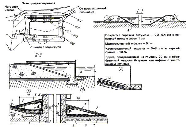 Черт. 23. Участок захоронения неутилизируемых промышленных отходов. Узлы В, Г, Д, Ж 1 - нагорная канава чистой воды; 2 - битумные маты - 10 мм; 3 - дрена Д-150; 4 - ливнеотводной лоток