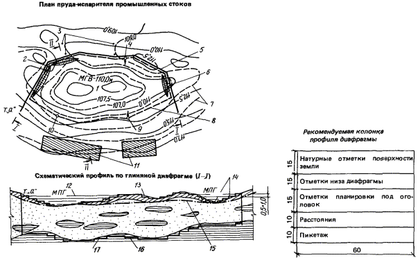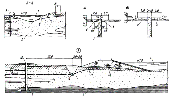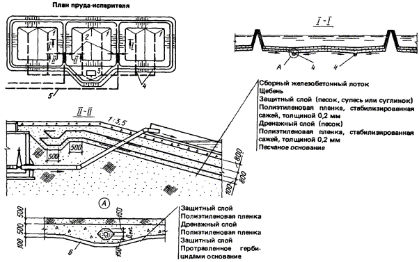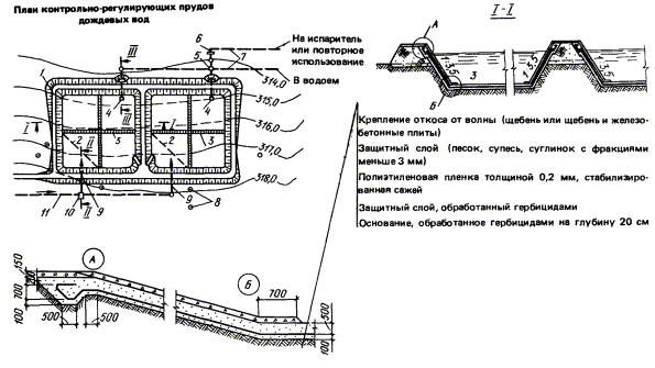полиэтиленовой пленки однослойный. 1 - ограждающая дамба; 2 - нефтеперехватываюшая западь; 3 - плиты маячные железобетонные размером 2,0´2,0´0,12 м; 4 - башенный водосброс из пруда; 5 - камера переключения на выпуске; 6 - насосная станция; 7 - отводящие трубопроводы; 8 - контрольные скважины; 9 - выпуск в пруд; 10 - камера переключения с решеткой; 11 - подводящий коллектор Конструктивно однослойный экран (черт. 5 - 7) состоит из спланированного и протравленного гербицидами основания из однородного грунта на глубину 15 - 20 см с фракциями не крупнее 3 мм, уплотненного гладкими катками. При наличии в грунтах более крупных фракций в основании устраивается песчаная подготовка слоем не менее 10 см. На пленку укладывается защитный слой из мелкозернистого грунта толщиной 0,5 м по дну и 0,8 м на откосах. Заложение откосов должно быть не круче 1:3,5. Защитный слой устраивается сразу на полную толщину пионерным способом бульдозером. Необходимость крепления пригрузки на откосах устанавливается расчетами в зависимости от волновых воздействий.