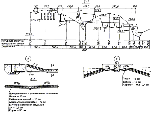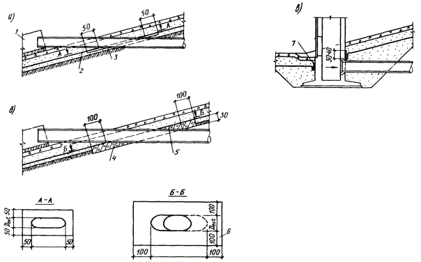 ЭКРАН БЕТОНОПЛЕНОЧНЫЙ5.6. Значительное распространение получили бетонопленочные экраны, в которых бетон выполняет защитные функции, а пленка - противофильтрационные. Монолитные или сборные железобетонные плиты толщиной 8 - 15 см укладываются на защищенную от повреждений пленку. Основание под пленку устраивается как для пленочного экрана. При укладке сборных железобетонных плит на пленку следует соблюдать повышенную осторожность. ЭКРАН АСФАЛЬТОБЕТОННЫЙ ОДНОСЛОЙНЫЙ С БИТУМНЫМ ПОКРЫТИЕМ5.7. Асфальтобетонные экраны (черт. 4) выполняются из гидротехнического мелкозернистого асфальта. Основанием однослойного экрана могут быть практически любые грунты, поддающиеся обработке грейдером, с модулем деформации после уплотнения не менее 10 МПа (100 кгс/см2). После планировки грунты подвергаются обработке (протравливанию) гербицидами на глубину 20 см. Затем производится поверхностная обработка грунта на глубину 10 - 15 см с внесением битума или сырой нефти из расчета 1,5 - 2,0 кг/м2. После чего основание уплотняется 5-тонными катками до полного устранения деформации. При сравнительно слабых пылеватых супесях и суглинках перед розливом нефти или битума рекомендуется вносить активные добавки - цемент или известь с расходом, указанным в таб. 1 СНиП 2.01.28-85. На подготовленное основание укладывается мелкозернистый асфальтобетон слоем 40 - 60 мм. Поверхность асфальтобетона покрывается слоем жидкого битума толщиной 2 - 4 мм с последующей посыпкой слоем песка толщиной 5 - 10 мм. При напорах до 5 - 10 м экран считается нефильтрующим. На откосах при необходимости устраивается дополнительное крепление, обоснованное волновыми расчетами. На черт. 4 приведена конструкция экрана, в основании которого залегают супеси или суглинки (размеры даны в сантиметрах). ЭКРАН АСФАЛЬТОБЕТОННЫЙ ДВУХСЛОЙНЫЙ С ДРЕНАЖНОЙ ПРОСЛОЙКОЙ5.8. При двухслойном экране промежуточный слой устраивается из сортированного гравия или щебня слоем 15 - 20 см с крупностью фракции 10 - 40 мм, покрытых битумом (черный гравий). Обработка верхнего и нижнего слоев асфальтобетона такая же, как для однослойного экрана. При двухслойном экране для сбора и отвода дренажной воды из межслойного пространства дно емкостных сооружений должно быть с уклоном 10 - 20 ‰ к трубчатым дренам. Расстояние между дренами следует принимать 100 - 200 м. Продольный уклон трубчатых дрен - 2 - 5 ‰. ЭКРАН АСФАЛЬТОБЕТОННЫЙ С ПОКРЫТИЕМ БИТУМНО-ЛАТЕКСНОЙ ЭМУЛЬСИЕЙ5.9. В отличие от асфальтобетонного экрана в рассматриваемом экране вместо розлива по асфальту чистого битума слоем 2 - 4 мм производится розлив битумно-латексной эмульсии слоем 4 - 6 мм, состоящей из 20 % латекса и 80 % битума по массе. Битумно-латексная эмульсия наносится на горизонтальную поверхность 1 - 2 слоями, а на откосы - 2 - 3 слоями толщиной 2 мм. Черт. 4. Экран асфальтобетонный однослойный с битумным покрытием 1 - мелкозернистый асфальт - толщина слоя 5 см; 2 - битумные маты на стеклоткани (ГОСТ 8481-75) - в 2 - 4 слоя; 3 - гравийно-песчаная смесь; 4 - анкер, шайба и гайка Д-20; 5 - прижимной антисептированный брус размером 16´12 см; 6 - крупнозернистый асфальт-толщина слоя 6 см; 7 - грунт, протравленный и обработанный битумом или нефтью Ввиду чувствительности экрана к свету поверхность его засыпается защитным слоем из однородного грунта или промышленных отходов фракцией не более 3 мм. Толщина защитного слоя не 