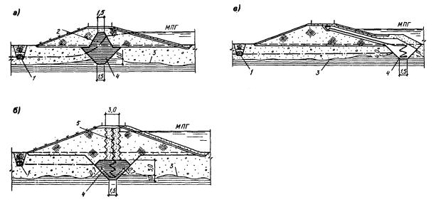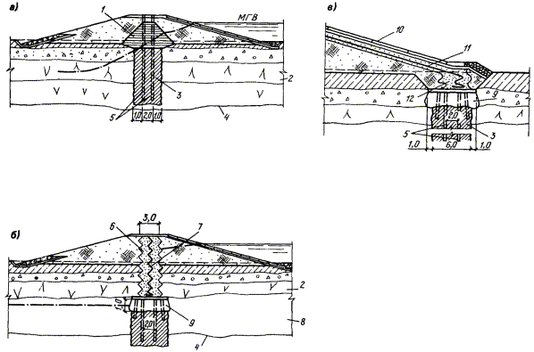 полиэтиленовой пленки однослойный. 1 - лоток из сборных железобетонных блоков; 2 - щебень с проливкой цементным раствором; 3 - щебень Черт. 7. Экран из полиэтиленовой пленки однослойный. Узлы а - деталь пропуска стальной трубы через экран из полиэтиленовой пленки на откосе; б - деталь пропуска железобетонной трубы через экран из полиэтиленовой пленки; в - сопряжение пленочного экрана с бетонными и железобетонными сооружениями; 1 - сборный железобетонный лоток; 2 - полиэтиленовая пленка экрана, приклеиваемая к диафрагме битумной мастикой БКС или УМС-50; 3 - стальная диафрагма, привариваемая к трубе сплошным швом; 4 - монолитная железобетонная плита; 5 - липкая лента (для надежности сопряжения после приклейки основных полотнищ щели в пленке по углам башни заделываются наклейкой липкой ленты в 2 - 3 слоя); 6 - плита, покрываемая битумной мастикой, на которую затем наклеивается пленка; 7 - натирка бетонной поверхности цементным раствором М-100 с последующей окраской мастикой БКС или УМС-50 и наклейкой пленки ЭКРАН ИЗ ПОЛИЭТИЛЕНОВОЙ ПЛЕНКИ ДВУХСЛОЙНЫЙ, С ДРЕНАЖНОЙ ПРОСЛОЙКОЙ5.12. При двухслойном экране (черт. 8) промежуточный (дренажный) слой устраивается из качественного песка слоем 0,5 м. Нижний и верхний защитные слои выполняются как для однослойного экрана. Сопряжение полиэтиленового экрана с сооружениями и коммуникациями является одним из наиболее ответственных мест противофильтрационного устройства. Пленка в районе бетонных опор и труб приклеивается к ним горячей битумной мастикой, которую одновременно наносят на тщательно очищенный бетон или металл и края пленки. Ширина полосы наносимой мастики не менее 15 - 20 см. Места соединения пленки тщательно прокатывают деревянным валиком. Для приклеивания пленки применяют мастику, приготовляемую следующим образом: битум марки БН-4 разогревают до жидкого состояния, добавляют в него 5 % (по массе) резиновой крошки и варят эту смесь в течение часа, тщательно перемешивая. После охлаждения до 120 - 110 °С в смесь малыми дозами, во избежание воспламенения, добавляют, тщательно перемешивая, 5 % солярного масла. Затем мастику следует несколько охладить и проверить, не прожигает ли она пленку. После чего мастика готова к употреблению. ПРОТИВОФИЛЬТРАЦИОННЫЕ ЗАВЕСЫ5.13. При проектировании полигонов для захоронения токсичных отходов и испарителей вредных стоков могут применяться следующие типы противофильтрационных завес: вертикальная глиняная диафрагма, выполняемая методом «стена в грунте» (черт. 9); грунтовая диафрагма «стена в грунте» в сочетании с полиэтиленовой пленкой (черт. 10): комбинированная завеса, состоящая из глиняной диафрагмы («стена в грунте») в сочетании с дренажом (черт. 11, 12); глиняная завеса в виде «зуба», выполняемого в открытой траншее (черт. 13); глиняная завеса в виде «зуба» в сочетании с полиэтиленовой пленкой (черт. 13); цементационная завеса (черт. 14); дренажные завесы (черт. 15): в виде открытого канала; в виде закрытой трубчатой дрены; в виде ряда вертикальных скважин; комбинированные дренажные завесы (траншея и самоизливающиеся в нее скважины; закрытая дрена и самоизливающиеся в нее скважины). Проектируются завесы с использованием соответствующих инструкций и норм. Завесы конкурируют с экранами; выбор завесы или экрана решается технико-экономическими расчетами. Преимуществом завес является в