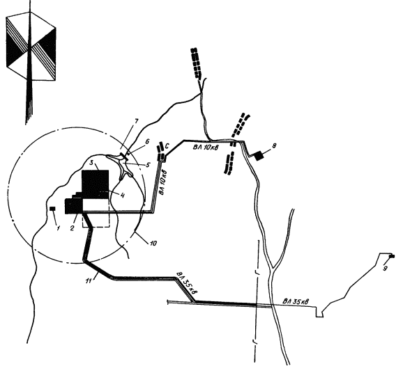 Черт. 18. Ситуационный план полигона по обезвреживанию и захоронению токсичных промышленных отходов (M 1:25000) 1 - сооружения хозяйственно-питьевого водоснабжения; 2 - завод по обезвреживанию и утилизации токсичных промышленных отходов; 3 - участок захоронения неутилизируемых промышленных отходов; 4 - очистные сооружения бытовой канализации; 5 - пруд дождевых вод; 6 - насосная станция промышленной воды; 7 - плотина; 8 - жилой поселок; 9 - подстанция 110/35 кВ; 10 - граница санитарно-защитной зоны; 11 - подъездная автодорога грунтовые воды - верховодка на глубине 1,5 - 5,0 м имеют периодический и местами линзовый характер; постоянный горизонт воды глубиной 15 - 25 м с уклоном в северном направлении; воды слабо минерализованы; коэффициенты фильтрации грунтов, м/сут: суглинки .................................. 0,05 - 0,5 супеси ....................................... 0,2 - 2,0 пески ........................................ 0,5 - 10,0 глины ....................................... 0,1 - 0,01 высококачественные глины с коэффициентом фильтрации менее 0,001 м/сут в регионе отсутствуют. 7.2. Исходя из анализа гидрогеологических условий площадки с учетом требований СНиП 2.01.28-85 под картами и бункерами для захоронения отходов, а также под другими емкостными сооружениями предусматриваются водонепроницаемые экраны, а для исключения подтопления экранов грунтовыми водами - пластовые дренажи. Другие способы борьбы с подтоплением в данных условиях неэффективны. 7.3. Учитывая, что грунтовые воды в 7 км ниже полигона используются для питьевых целей, наблюдательные скважины с низовой стороны запроектированы с учетом возможности оборудования их артезианскими насосами для создания дренажной завесы, исключающей отток грунтовых вод ниже полигона. 7.4. В прил. 4 - 6 приведены примеры компоновки участка захоронения неутилизируемых промышленных отходов на спокойном рельефе (прил. 4), рекомендации по штатам (прил. 5) и режиму контроля химического состава дождевых и грунтовых вод (прил. 6).