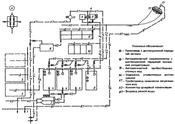 Черт. 26. Схема диспетчерского контроля и управления бригады ОХОС (наименования сооружений см. на черт. 20)