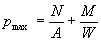 0,9 + Принимаем hpl = 0,9 м с тремя ступенями высотой по 0,3 м; h0,pl = 0,85 м. Размеры ступеней определим по прил. 3 (принимая c1 = c1¢ и с2 = с2¢). Учитывая, что таблица составлена при gb2 = 1, а в нашем случае gb2 = 1,1, расчетные значения рmax снижаем: px,max = 0,454/1,1 = 0,413 МПа (4,13 кгс/см2); рy,max = 0,42/1,1 = 0,382 МПа (3,82 кгс/см2). Вылет ступеней вдоль оси х: для 1-й ступени при h1 = 0,3 м, рх = 0,413 МПа (4,13 кгс/см2), b = 3,6 м находим c3 = 0,6 м при р = 0,45 МПа (4,5 кгс/см2) > 0,413 МПа (4,13 кгс/см2); для 2-й ступени при h1 + h2 = 0,6 м и b = 3,6 м находим c2 = 1,05 м при р = 0,56 МПа (5,6 кгс/см2) > 0,413 МПа (4,13 кгс/см2); c2=1,2 м при p=0,38 МПа < 0,413 МПа - то есть вылет, равный 1,2 м, не проходит; c1=1,65 - прочность на продавливание проверена при определении h0,pl. Вылет ступеней вдоль оси у: с3¢ = 0,6 м при р = 0,475 МПа (4,75 кгс/см2) > 0,382 МПа (3,82 кгс/см2); с2¢ = 1,05 м; c1¢ = 1,35 м. ОПРЕДЕЛЕНИЕ СЕЧЕНИЯ АРМАТУРЫ ПОДОШВЫ ФУНДАМЕНТА Моменты, действующие по граням ступеней в направлении оси х, определим по формуле (44) N = 4,8 МН (480 тc), Мx = 1,92 МН×м (192 тс×м), еx = 0,4 м, l = 4,5 м. В сечении 1-1: c1-1